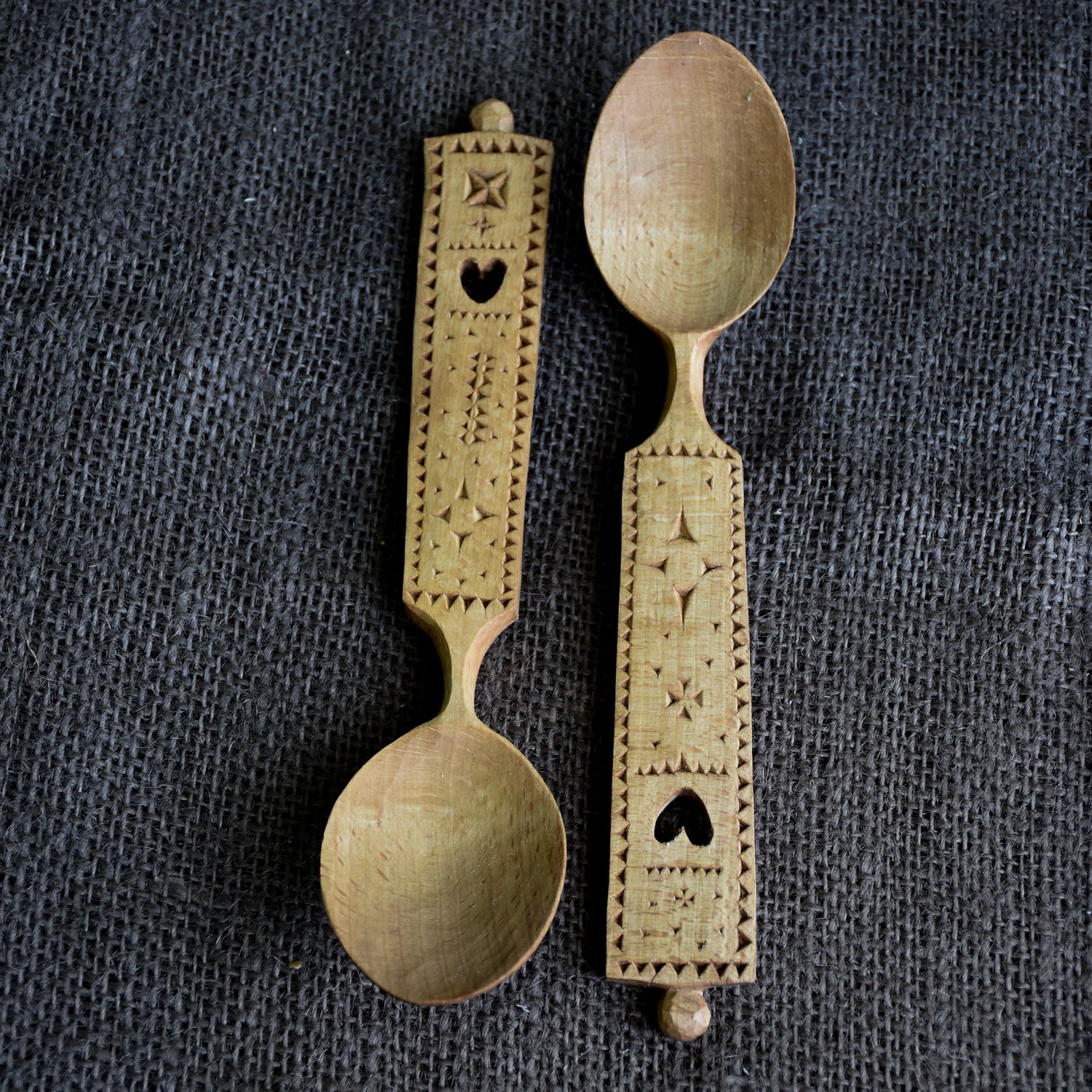 A hand carved Love Spoon with folk art inspired pattern. The ideal gift for newlyweds or a wooden anniversary gift!