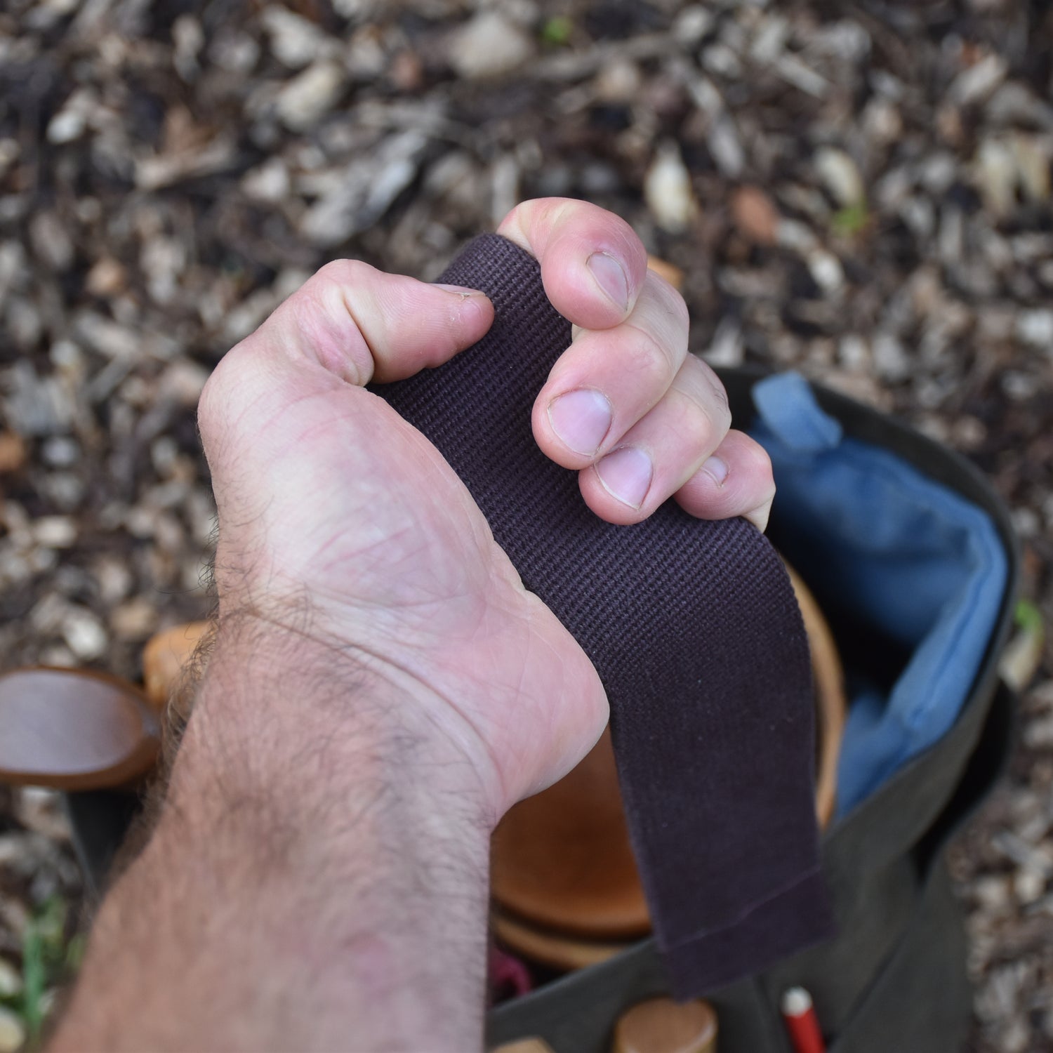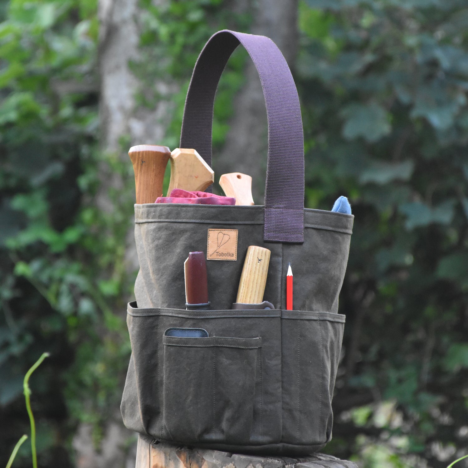 The bag features a new double woven carry handle which can be carried over the shoulder or simply carried in the hand. The bottom is padded and double layered waxed canvas to keep your tools dry and protected on wet ground. The canvas is heavy duty and will go the distance in storing and protecting your tools
